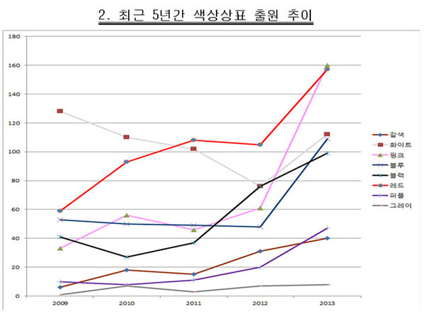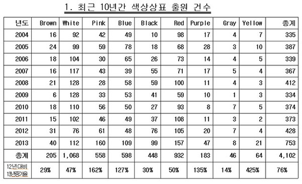 또한 화이트, 블랙, 옐로우 등 다른 색상 관련 상표를 포함한 전체 출원 건수는 428건에서 753건으로 76%나 늘어난 것으로 나타났다. -