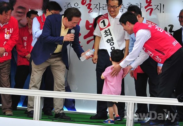 [포토]아이에게 물 건네 받는 정몽준 후보