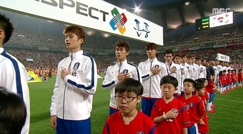 기성용(25·선덜랜드)이 왼손경례로 구설수에 올랐다.기성용은 28일 오후 8시 서울월드컵경기장에서 열린 '축구국가대표팀 브라질월드컵 출정식 경기' 튀니지와의 평가전 경기에 앞서 왼손으로 국기에 대한 경례를 하면서 논란이 일고 있다.이날 선발 출장한 기성용은 경기 시작 전 국민의례 행사에서 애국가가 울려 퍼지는 동안 다른 선수들과 달리 왼손을 오른쪽 가슴에 얹었다.대한민국 국기법 제 3조(국기에 대한 경례방법)에는 '제복을 입지 아니한 국민은 국기를 향하여 오른손을 펴서 왼쪽 가슴에 대고 국기를 주목한다'고 명시돼 있다.기성용 왼손경례를 접한 네티즌들은 "기성용 왼손경례 실수 맞아?", "오른손이 다친 것도 아니면서 대체 무슨 생각인거야", "기성용 왼손경례 무슨 의도로..", "기성용 국가대표 맞아?", "기성용 왼손경례 황당하다" 등의 비난의 목소리를 보냈다.[기성용 왼손경례 논란, 사진=MBC 중계화면 캡처]