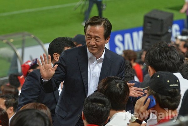 [포토]튀니지전 보러 온 관중들과 인사 나누는 정몽준 후보