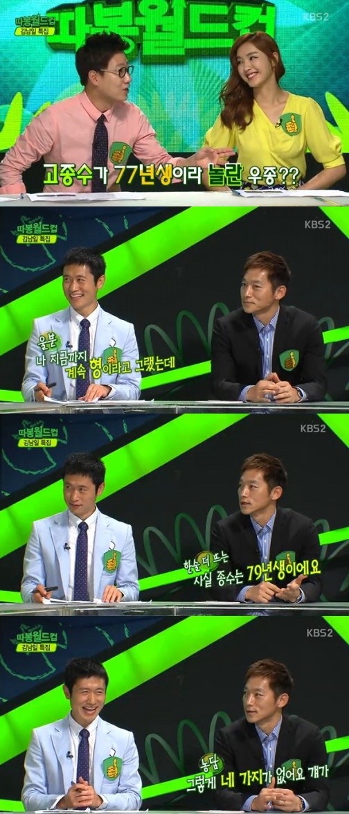 '따봉월드컵' 김남일이 고종수를 디스해 폭소를 자아냈다.28일 방송된 KBS 2TV '따봉 월드컵'에서는 최근 KBS 축구 해설위원이 된 김남일이 출연해 특유의 솔직한 입담을 선보였다.이날 MC를 맡은 정인영 아나운서는 "당시 부평고하면 김남일. 안양공고하면 이영표였다"라며 77년생 레전드 축구선수들을 언급했다. 이에 김남일은 "이영표가 넘버원이었고, 고종수는 금호고 대표선수였다"고 밝혔다.그러자 조우종 아나운서는 깜짝 놀라며 "고종수 코치가 77년생이냐. 나 지금까지 계속 형이라고 불렀다. 저번에도 가서 '종수형'이라고 그랬더니 '어 왔어'라고 했다. 나보다 동생이었어!"라고 흥분을 감추지 못했다.조우종의 반응에 김남일은 "제가 알기로는 종수가 79년생이다"라며 "그렇게 싸가지가 없어요 걔가"라고 돌직구 농담을 던져 주위를 웃음바다로 만들었다.['따봉월드컵' 김남일 고종수 디스, 사진=KBS2 '따봉월드컵' 방송 캡처]