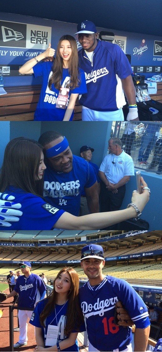 미쓰에이 수지가 시구를 앞두고 LA다저스 선수들과 인증샷을 찍었다.29일(한국시간) LA다저스 구단은 공식트위터를 통해 시구를 위해 다저스타디움을 찾은 수지와 다저스의 타자 야시엘 푸이그, 후안 유리베, 안드레 이디어 등과 함께 찍은 사진을 공개했다.공개된 사진 속 수지는 LA 다저스 유니폼을 입고 깜찍 발랄한 표정을 지으며 선수들과 기념촬영을 하고 있다.수지와 함께 사진을 찍은 선수들 역시 얼굴에 미소가 가득해 눈길을 끈다. 특히, 유리베는 수지를 보고 활짝 웃으며 악수를 청했다는 후문.한편, 이날 수지는 미국 캘리포니아주 로스앤젤레스 LA다저스타디움에서 열린 LA다저스와 신시내티 레즈의 경기에 앞서 시구자로 나섰다.이번 수지 시구는 다저스 구단의 요청으로 이뤄졌으며, 앞서 27일 류현진의 선발등판 경기를 직접 관전하며 응원하기도 했다.수지 시구 인증샷을 본 네티즌들은 "수지 시구 부러워", "수지 매력에 다들 아빠미소", "수지 시구 전 선수들과 화기애애", "다저스 선수들 수지 미모에 반한 듯", "수지 시구 다저스 홀렸네" 등의 반응을 보였다.[수지 시구, 사진=LA다저스 트위터]