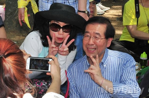 박원순 새정치민주연합 서울시장 후보가 29일 오후 서울 용산가족공원에서 열린 플래시몹 '원순씨 밥묵자'에서 주민들과 기념사진을 찍고 있다.