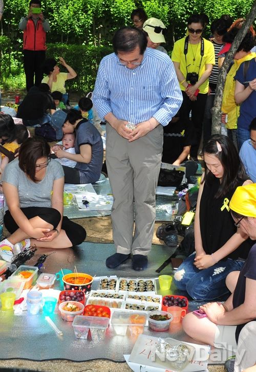 <박원순> 새정치민주연합 서울시장 후보가 29일 오후 서울 용산가족공원에서 열린 플래시몹 '원순씨 밥묵자'에서 주민들과 세월호참사를 애도하는 묵념을 하고 있다.