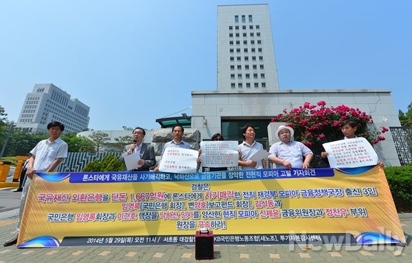 KB국민은행노동조합(제3노조)과 시민단체 투기자본감시센터가 28일 오전 대검찰청 앞에서 기자회견을 열고 임영록 KB금융그룹 회장, 신제윤 금융위원장 등을 검찰에 고발했다.