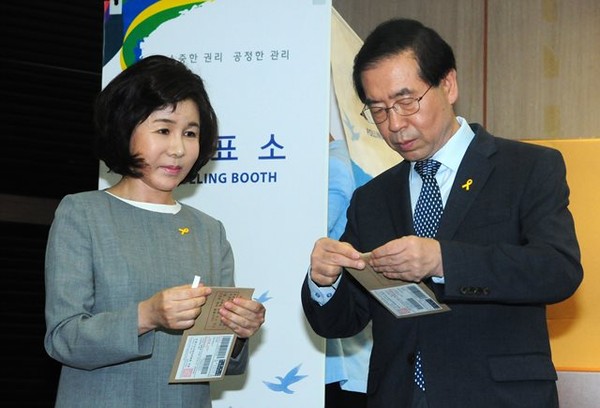 [포토]사전투표 하는 박원순 시장 후보 내외