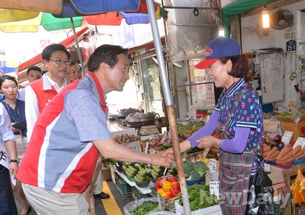 이날 정몽준 후보는 유세 차량 앞에서 연설을 마친 뒤 바닥에 엎드려 시민들에게 큰절 하는 것을 시작으로, 신림6동 인근 시장을 돌며 지지를 호소했다.
