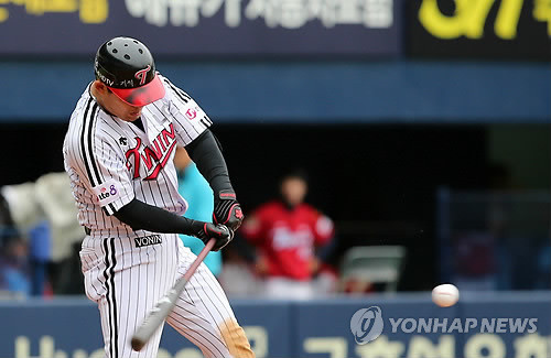 LG 트윈스의 4번타자 정의윤이 시즌 4호 넥센 히어로즈 강윤구 상대로 달아나는 솔로홈런포를 때려냈다.