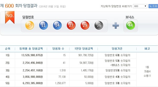 2014년 5월 31일 실시된 제600회 나눔로또 1등 당첨번호는 '5, 11, 14, 27, 29, 36'이며, 2등 보너스 번호는 44번이다.이번 로또 600회차 추첨 결과 1등 당첨자는 13명으로 9억179만8725원의 당첨금을 받게 됐다.1등 번호 중개와 보너스 번호를 맞힌 2등은 41명이며, 1인당 5498만7728원씩 지급받는다. 당첨번호 중 5개를 맞힌 3등은 1518명으로 당첨금은 각 148만5176원이다.5만원의 당첨금을 받는 4개의 번호를 맞힌 4등은 7만7138명이며, 5000원의 고정 당첨금을 받는 5등은 125만8677명이 나온 것으로 집계됐다.한편, 이번주 로또600 총 판매금액은 563억7251만9000원이다.[로또600회당첨번호, 사진=로또 홈페이지 캡처]