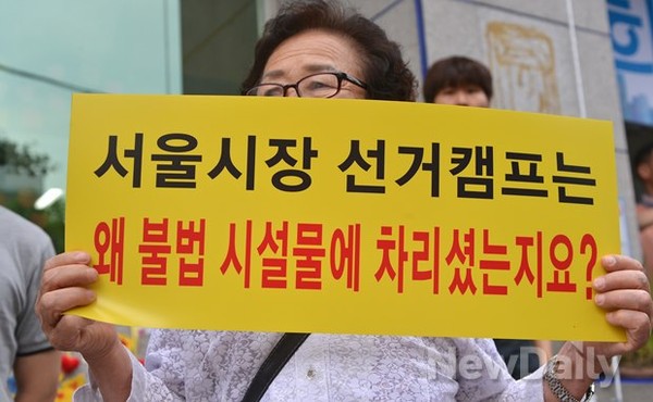 탈북민단체 및 탈북민들이 2일 오전 서울 종로구 종로5가 박원순 선거캠프 앞에서 북한인권 및 북한 정권에 대한 박원순 후보의 이념에 대한 입장을 규탄하는 기자회견을 가졌다이들은 탈북자 북송 반대 시위를 하면서 시민들이 친 텐트를 불법으로 몰아 수천만원의 벌금을 부과하던 박원순 시장이 자신의 선거사무소에는 버젓히 불법 가건물을 설치했다며, 박원순 후보의 행태를 비판했다.관련기사☞