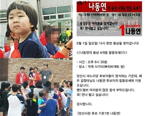 지난 1일 새누리당 나동연 경남 양산시장 후보 측은 선거 블로그에 '야꿍이와 야꿍이 아빠와 함께하는 나동연의 행복한 동행'이라는 글과 함께 사진을 게재했다. 나 후보가 야꿍이를 안고 양산 시민들과 만나는 모습을 공개하며 야꿍이 부자의 선거 유세 참석 사실을 알린 것.