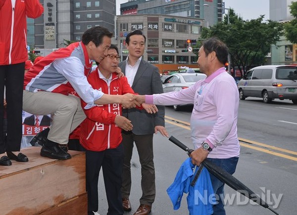 [포토]인사하는 시민과 눈높이 맞추는 정몽준 후보