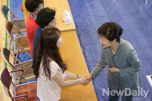 박근혜 대통령이 4일 오전 서울 종로구 청운효자동 제1투표소에서 제6회 전국지방동시선거 투표를 마친 뒤 참관인들과 악수를 나누고 있다.