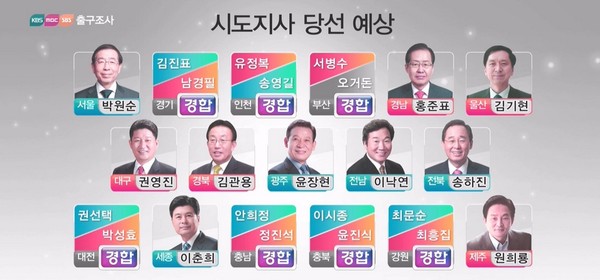 4일 오후 6시 KBS MBC SBS 등 지상파 3사는 이날 투표자들을 상대로 진행한 17개 시도지사 선거 출구조사 결과를 발표했다.