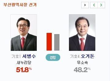 한편 JTBC 출구조사 결과에서는 오거돈 후보가 53.7%, 서병수 후보가 46.3%를 얻은 것으로 나타났다.