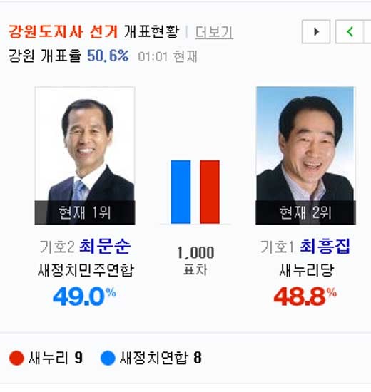 표차가 1,000여 표에 불과해 언제든지 뒤집힐 수 있는 상황이다.때문에 누가 차기 강원도지사가 될 것인지는