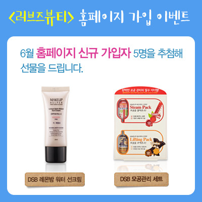 이번 홈페이지 가입 이벤트는 오는 6월 30일까지 공식 홈페이지 가입자 들을 대상으로 진행되며, 추첨을 통해 5명에게 [DSB 메이크업헬퍼-모공관리 2STEP]과 [레몬밤 선크림 세트]를 증정한다.