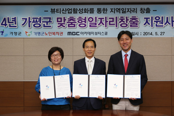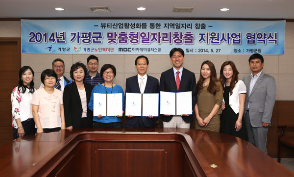 <MBC아카데미뷰티스쿨>은 지난 5월 27일 경기 가평군과 지역 일자리 창출을 위한 업무협약을 체결했다.뷰티산업 활성화를 통해 지역 내 일자리 창출을 위한 [지역맞춤화사업]의 일환인 이번 협약은 가평군과 지리적으로 밀접한 MBC아카데미뷰티스쿨 춘천캠퍼스에서 전담해 뷰티 교육을 실시하고 가평군 내 뷰티산업 발전에도 힘쓸 예정이다.