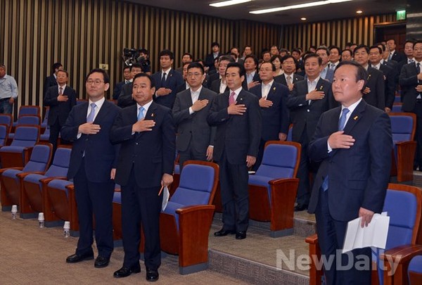 새누리당 의원들이 11일 오전 서울 여의도 국회에서 열린 새누리당 의원총회에 참석해 국기에대한 경례를 하고 있다.