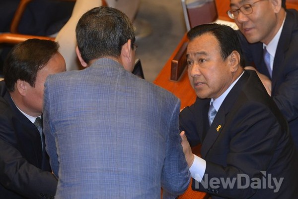 이완구 원내수석대표가 12일 오전 서울 국회에서 열린 본회의에서 대화를 나누고 있다.