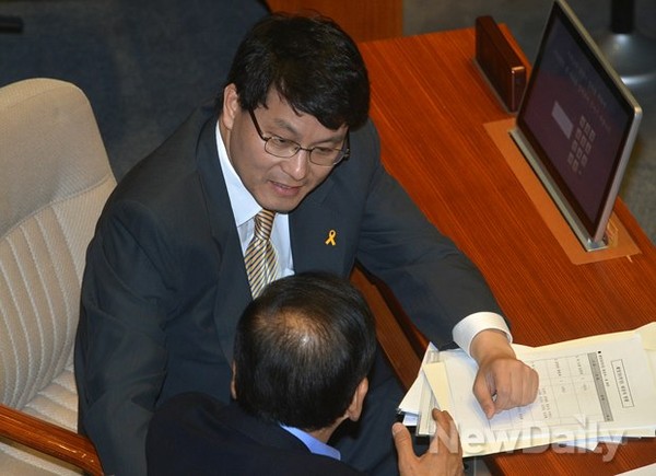 새누리당 이재오의원과 윤상현 원내수석부대표가 12일 오전 서울 국회에서 열린 본회의에서 대화를 나누고 있다.