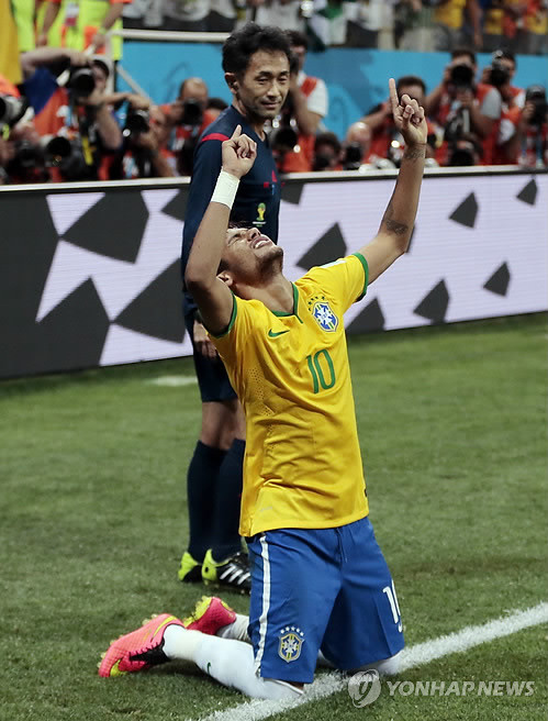 해외언론이 2014 브라질 월드컵 개막전에서 2골 터뜨린 네이마르 다 실바(22, FC 바르셀로나)에 극찬을 보냈다.브라질 축구대표팀은 13일(이하 한국시간) 브라질 상파울루의 아레나 데 상파울루에서 열린 조별 예선 A조 크로아티아와의 경기에서 네이마르와 오스카의 골로 3-1로 역전승을 거뒀다.이날 네이마르는 전반 26분 월드컵 첫 경고를 받았지만, 29분 동점골을 넣으며 분위기를 반전시켰다. 이어 후반 25분 패널티킥으로 역전에 성공하며 해결사 역할을 톡톡히 했다.경기 후 네이마르는 국제축구연맹(FIFA)가 선정한 맨 오브 매치(Man of the Match)에 이름을 올렸다.미국의 스포츠 전문 채널 ESPN은 네이마르 2골에 대해 "브라질의 위대한 희망, 네아미르가 개막전부터 빛났다"며 "네이마르가 홈에서 열린 개막전을 불꽃축제로 만들었다. 브라질의 3-1 승리에 결정적인 역할을 했다"고 밝혔다.이어 "네이마르의 에너지는 넘쳐흘렀고, 기술 또한 모두를 압도했다. 월드컵 첫 경기였지만, 자신의 기량을 마음껏 펼쳐보였다. 네이마르로부터 브라질의 우승을 향한 여정이 시작됐다"며 그의 활약을 높이 격찬했다.또한, 영국의 로이터 통신은 "네이마르 2골 활약이 브라질의 극적인 개막전 승리를 이끌었다"고 전했다.[네이마르 2골, 사진=연합뉴스]