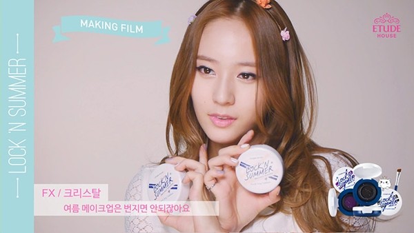 <에뛰드하우스>가 모델인 에프엑스 멤버 [크리스탈]의 썸머 메이크업인 [락 앤 썸머] 화보 촬영 영상을 공개했다.영상 속 크리스탈은 결점 없이 깨끗하고 촉촉한 피부에 블랙과 퍼플 컬러의 아이라이너를 레이어링하여 연출한 독특하고 강렬한 눈매를 강조, 크리스탈 특유의 시크하면서도 상큼발랄한 매력을 한껏 드러내고 있다.