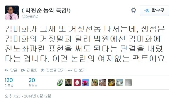 김미화와 신혜식간 소송은 종북이 아니라 친노좌파가 핵심이었습니다. 그 소송에서 법원은 김미화를 친노좌파라 불러도 된다고 판결한 겁니다.
