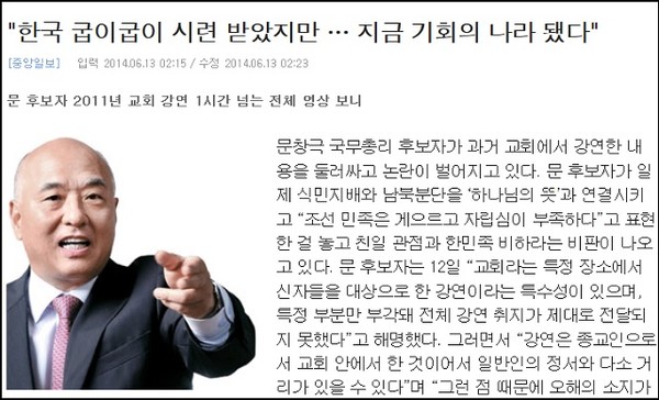 뒤늦게나마 주류 신문들이 진실과 정의의 편에 서기 시작한다.중앙일보는 13일 “문창극 국무총리 후보자가 과거 교회에서 강연한 내용을 둘러싸고 논란이 벌어지고 있다. 문 후보자가 일제 식민지배와 남북분단을 ‘하나님의 뜻’과 연결시키고 ‘조선 민족은 게으르고 자립심이 부족하다’고 표현한 걸 놓고 친일 관점과 한민족 비하라는 비판이 나오고 있다”며 12일 문 후보자의 “교회라는 특정 장소에서 신자들을 대상으로 한 강연이라는 특수성이 있으며, 특정 부분만 부각돼 전체 강연 취지가 제대로 전달되지 못했다. 강연은 종교인으로서 교회 안에서 한 것이어서 일반인의 정서와 다소 거리가 있을 수 있다. 그런 점 때문에 오해의 소지가 생긴 것은 유감이다. 일부 언론의 악의적이고 왜곡된 편집에 법적 대응 할 것”이라는 내용의 입장을 전했다. 그러면서 2011년 ‘기회의 나라를 만들어 주십시오’라는 교회특강을 요약해서 보도했다.