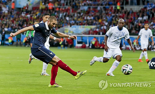 프랑스가 간판 공격수 벤제마 멀티골에 힘입어 온두라스를 완파하고 기분 좋은 첫 승을 올렸다.프랑스는 16일(한국시간) 브라질 포르투 알레그리의 에스타디오 베이라-리오 경기장에서 열린 2014 브라질 월드컵 E조 온두라스와의 경기에서 3-0 완승을 거뒀다.이날 온두라스는 전반전 2회 경고 누적으로 퇴장당한 팔라시오와 함께 페널티킥을 내주며 자멸했다. 팔라시오는 이번 대회 퇴장 2호의 불명예를 안았다.프랑스는 한 수 아래 온두라스를 상대로 초반부터 중원을 장악했지만 거센 공격에도 골대만 두 번을 맞추며 마무리에서 약한 모습을 보였다.그러다 전반 막판 결정적인 기회를 잡앗다. 프랑스는 전반 45분 온두라스 윌슨 팔라시오스의 파울로 얻은 페널티킥을 카림 벤제마가 성공시키켜 전반전을 1-0으로 마쳤다.프랑스는 후반 3분 온두라스의 골키퍼 노엘 바야다레스의 자책골로 2-0으로 앞섰다. 골대를 맞고 나온 벤제마의 슈팅을 바야다레스 골키퍼가 빠르게 걷어냈지만, 골라인 판독기 측정결과 골로 인정된 것.상승세를 탄 프랑스는 후반 27분 벤제마가 오른발 슛으로 개인 두 번째 골을 터뜨리며 승부에 쐐기를 박았다.벤제마 멀티골과 함께 3-0으로 경기를 마무리한 프랑스는 4년전 남아공 대회 조별리그에서 탈락한 아쉬움을 접고 16년 만에 조별리그 첫 경기에서 승리를 거두는 기쁨을 누렸다.['프랑스 온드라스' 벤제마 멀티골, 사진=연합뉴스]