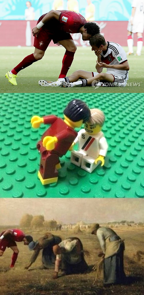 포르투갈 수비수 페페(31·레알 마드리드) 박치기 퇴장으로 패러디가 쏟아지고 있다.페페는 17일(한국시간) 브라질월드컵 G조 조별리그 독일전에서 0-2로 끌려가던 전반 37분 넘어진 독일 토마스 뮐러(24, 바이에르 뮌헨)의 머리를 들이받는 비신사적인 행동으로 퇴장을 당했다.페페는 이번 브라질 월드컵에서 세 번째로 퇴장을 당한 선수가 됐다. 페페 박치기 퇴장으로 수적 열세에 몰린 포르투갈은 결국 독일에 0-4로 완패했다.경기 직후 각종 온라인 커뮤니티와 SNS상에는 페페의 박치기 퇴장을 패러디한 이미지들이 올라와 눈길을 끌었다.한 네티즌은 페페 박치기를 화가 밀레의 '이삭 줍는 사람들'과 합성하며 "페페가 아주머니들이 이삭을 너무 많이 줍는다며 머리로 들이받고 있다"고 설명해 웃음을 자아냈다.캐나다 출신 기자 앤디 페트릴로는 자신의 트위터를 통해 레고 블럭로 페페 박치기 장면을 그대로 재현하기도 했다.이를 접한 네티즌들은 "페페 박치기 퇴장 황당하더라", "축구는 팀 플레이가 우선인데 페페가 모든 걸 망쳤다", "페페 박치기 패러디 정말 웃기다", "페페 고국에 돌아가면 욕 엄청 먹겠네", "페페 박치기 퇴장 빅매치 독일 포르투갈 경기에 찬물을 끼얹은 꼴" 등의 반응을 보였다.[페페 박치기 패러디, 사진=연합뉴스/온라인 커뮤니티]