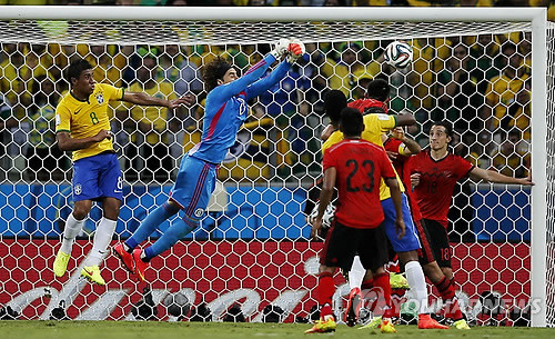 신들린 선방으로 브라질의 거센 공격을 막아낸 기예르모 오초아(29, 아작시오)가 FIFA 최우수선수(MOM, Man Of the Match)에 선정됐다.브라질 멕시코는 18일 새벽 4시(이하 한국시간) 브라질 포르탈레자 에스타디오 카스텔라오에서 열린 2014 브라질 월드컵 조별리그 A조 2차전에서 득점 없이 0-0으로 비겼다.이는 F조 예선 이란과 나이지리아전에 이은 이번 대회 두 번째 무승부로 양팀은 나란히 1승 1무, 승점 4점을 기록했다.국제축구연맹(FIFA)은 멕시코 브라질 경기가 끝난 뒤 이 경기의 선수(Man of the Match)로 오초아를 뽑았다.이날 멕시코 골문을 지킨 오초아는 잇단 선방으로 팀을 패전 위기에서 구했다. 오초아는 전반전 브라질 네이마르의 헤딩슛을 쳐내는가 하면, 전반 종료 직전 파울리뉴의 위협적인 슈팅을 막아냈다.후반 40분에는 네이마르의 프리킥에 이은 티아구 실바의 결정적인 노마크 헤딩슛을 펀칭하는 등 무려 8차례의 슛을 모두 막아내며 눈부신 활약을 펼쳤다.이에 오초아는 골키퍼로는 드물게 FIFA에서 선정한 최우수선수(MOM)가 됐다. 오초아는 카메룬과 조별리그 경기를 포함해 두 경기 연속 무실점을 기록하고 있다.[브라질 멕시코 전 오초아 MOM 선정, 사진=연합뉴스]