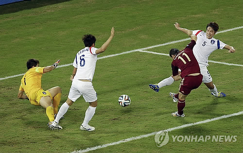 브라질월드컵에 출전한 대한민국 축구대표팀이 첫 상대 러시아와 무승부를 기록했다.18일 브라질 쿠이아바의 판타나우 경기장에서 열린 러시아와의 H조 첫 경기에서 대한민국은 0-0으로 전반을 마쳤다. 후반 23분 이근호의 선제골로 앞서나갔다. 하지만 6분 만에 러시아에 동점골을 헌납했다. 후반 29분 러시아 대표팀의 알렉산드르 케르자코프(제니트)에게 동점골을 허용했다. 경기는 1대1 무승부로 끝났다.