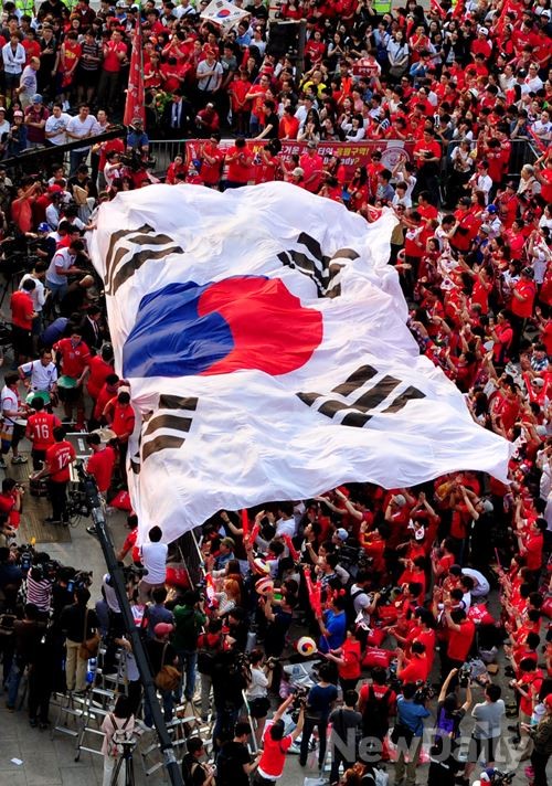 [2014 브라질 월드컵] H조 조별리그 첫경기 한국과 러시아전의 거리응원이 18일 오전 서울 광화문광장에서 열렸다.이날 한국은 후반 23분 이근호의 선제골, 7분 후 알렉산드르 케르자코프에게 동점골을 허용하며 1-1로 경기를 마쳤다.승점 1점을 획득한 한국은 같은 날 알제리를 2-1로 꺾은 벨기에에 이어 러시아와 함께 H조 공동 2위를 기록했다.한편 한국은 오는 23일 오전 4시 알제리와 H조(대한민국, 러시아, 벨기에, 알제리) 조별리그 2차전을 갖는다.