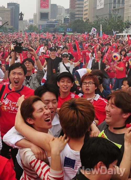 [2014 브라질 월드컵] H조 조별리그 첫경기 한국과 러시아전의 거리응원이 18일 오전 서울 광화문광장에서 열렸다.이날 한국은 후반 23분 이근호의 선제골, 7분 후 알렉산드르 케르자코프에게 동점골을 허용하며 1-1 무승부로 경기를 마쳤다.승점 1점을 획득한 한국은 같은 날 알제리를 2-1로 꺾은 벨기에에 이어 러시아와 함께 H조 공동 2위를 기록했다.한편 한국은 오는 23일 오전 4시 알제리와 H조(대한민국, 러시아, 벨기에, 알제리) 조별리그 2차전을 갖는다.