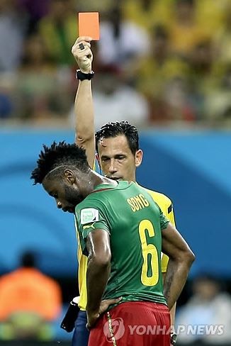 전반 40분 카메룬의 알렉스 송(바르셀로나)은 크로아티아 만주키치(바이에른 뮌헨)의 등을 때려 퇴장당했다.알렉스 송은 공을 향해 돌진하던 만주키치의 등을 뒤에서 갑자기 팔꿈치로 가격했고 이를 본 주심은 곧장 레드카드를 꺼내들었다.