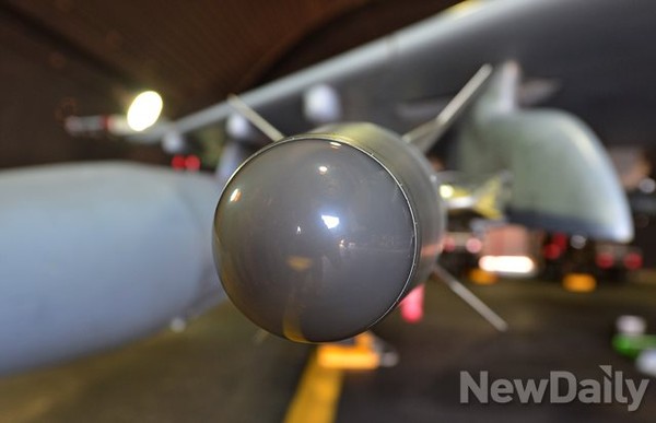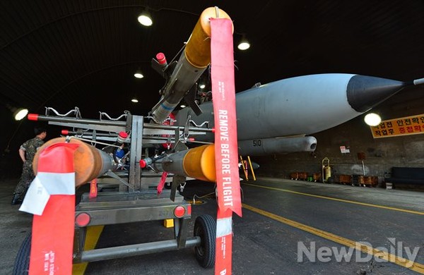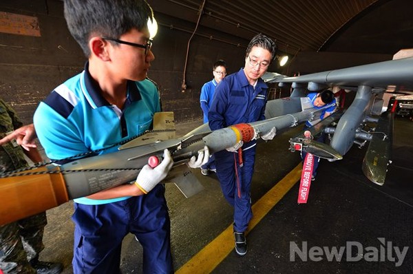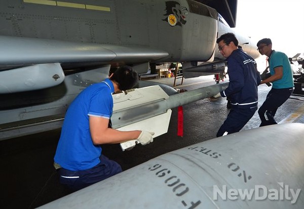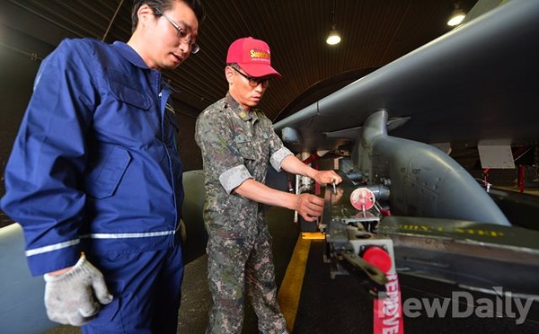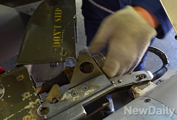 지난 18일 충북 청주 제 17전투비행단(17전비) 전투기 격납고에서 뉴데일리(순정우) 기자가 F-4E 팬텀 전투기에 AIM-9 일명 [사이더와인더] 미사일을 직접 장착하고 있다.