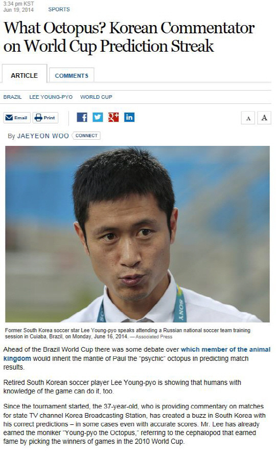 윌스트리트저널은 "국 국가대표 출신인 이영표 KBS 해설위원이 이번 브라질 월드컵에서 뛰어난 예지력을 선보여 관심을 끌고 있다"며 그의 경기 관련 멘트를 상세히 다뤘다.