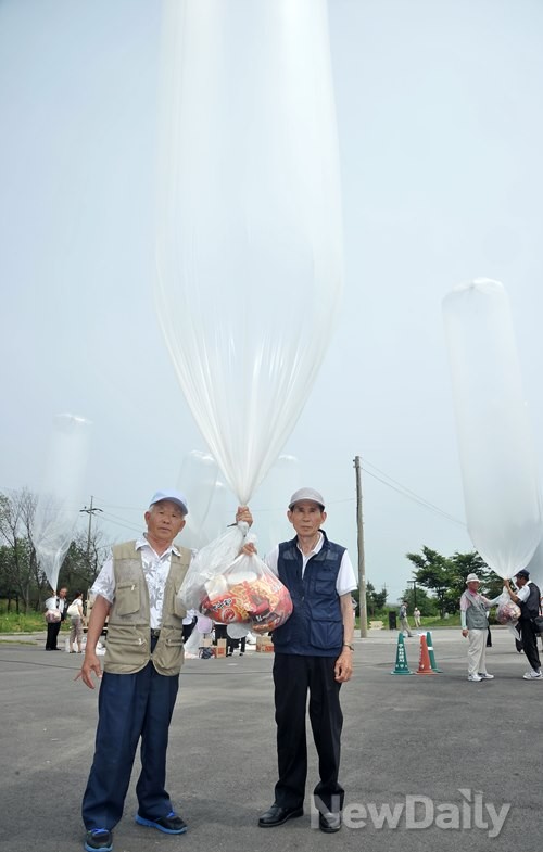 남북보수연합을 비롯한 애국보수단체 회원들이 초코파이, 건빵 등 먹거리를 대형풍선을 이용해 북녘으로 날리는 행사를 21일 경기도 파주시 임진각주차장에서 열었다.