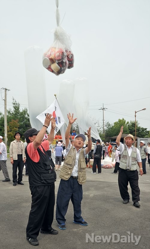 남북보수연합을 비롯한 애국보수단체 회원들이 초코파이, 건빵 등 먹거리를 대형풍선을 이용해 북녘으로 날리는 행사를 21일 경기도 파주시 임진각주차장에서 열었다.