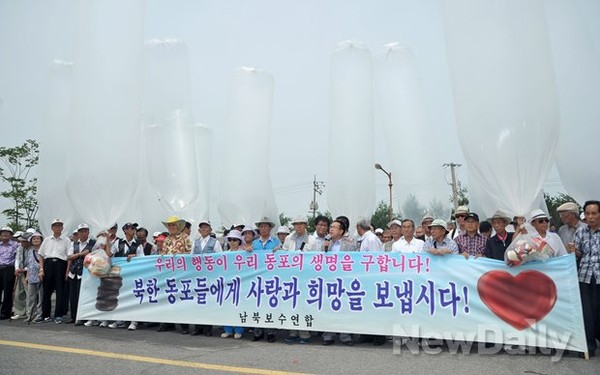 남북보수연합을 비롯한 애국보수단체 회원들이 초코파이, 건빵 등 먹거리를 대형풍선을 이용해 북녘으로 날리는 행사를 21일 경기도 파주시 임진각주차장에서 열었다.
