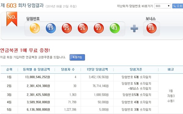 2014년 6월 21일 실시된 제603회 나눔로또 1등 당첨번호는 '2, 19, 25, 26, 27, 43'이며, 2등 보너스 번호는 28번이다.이번 로또 603회차 추첨 결과 1등 당첨자는 4명으로 34억5213만6563원의 당첨금을 받게 됐다.1등 번호 중개와 보너스 번호를 맞힌 2등은 30명이며, 1인당 7671만4146원씩 지급받는다. 당첨번호 중 5개를 맞힌 3등은 1363명으로 당첨금은 각 168만8500원이다.5만원의 당첨금을 받는 4개의 번호를 맞힌 4등은 7만1799명이며, 5000원의 고정 당첨금을 받는 5등은 122만7396명이 나온 것으로 집계됐다.한편, 이번주 로또603 총 판매금액은 562억7665만원이다.[로또603회당첨번호, 사진=로또 홈페이지 캡처]