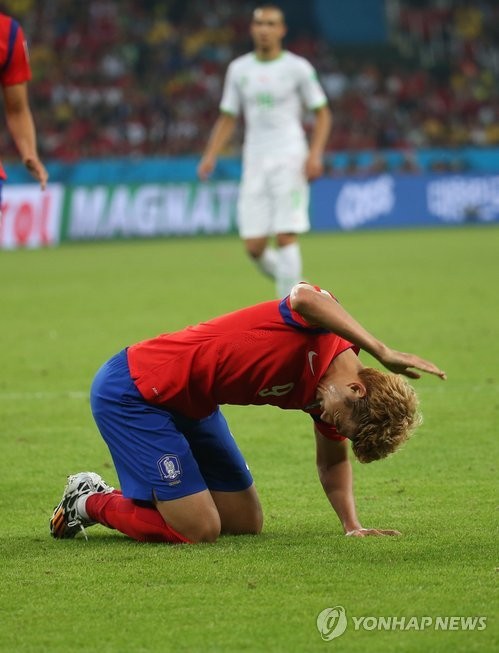 한국 알제리 전에서 홀로 빛난 손흥민(22,레버쿠젠)이 눈물을 보였다.한국은 23일 오전 4시(한국시간) 브라질 포르투 알레그리의 에스타디오 베이라 리오 경기장에서 열린 2014 브라질 월드컵 조별리그 H조 2차전 알제리와의 경기에서 2-4로 패했다. 이로써 1무1패가 된 한국은 H조 꼴찌로 추락하며 16강 자력 진출이 불가능해졌다.이날 한국 선수들은 경기 전반 알제리의 파상공세 속에 단 한 번도 슈팅을 해보지도 못한 채 슬리마니, 할리시, 자부에 연속골을 내주며 0-3으로 답답한 경기를 펼쳤다.후반 5분 손흥민이 만회골을 넣었지만 12분 뒤 알제리 야신 브라히미에게 쐐기골을 허용했다. 구자철이 후반 27분 두 번째 골을 넣었으나 벌어진 점수 차를 따라잡기에는 역부족이었다.손흥민은 한국 알제리 경기 직후 인터뷰에서 "초반에 사소한 실수로 많은 실점을 해서 어려운 경기가 됐다. 처음부터 후반처럼 정신을 바짝 차리고 했으면 더 좋았을 걸 후회가 많다"고 말하며 울먹였다.이어 "(하프타임에) 후반에 나가서는 후회없는 플레이를 하자고 얘길했다. 너무 아쉽고 후회되는 경기다"고 밝혔다.한편, 한국은 오는 27일 오전 5시에 벨기에와 H조 조별리그 3차전을 치른다.['한국 알제리' 손흥민 눈물, 사진=연합뉴스]