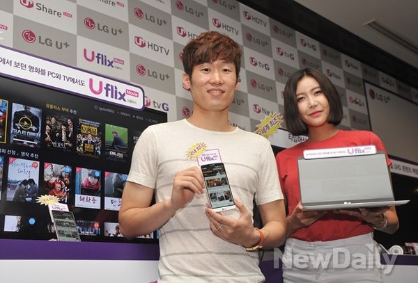 박지성이 23일 서울 세종문화회관 세종홀에서 열린 [LG유플러스, 세계 최초 超광대역 LTE-A로 비디오 LTE시대를 연다] 기자회견에 앞선 포토타임 행사에 참석해 모델과 함께 포즈를 취하고 있다.