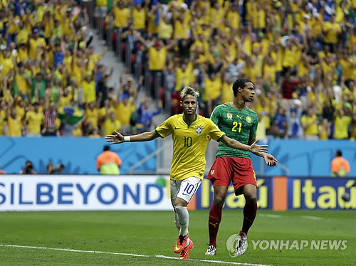 네이마르 다 실바(22·FC 바르셀로나)가 브라질 카메룬 경기에서 (22, 바르셀로나)가 최우수선수(MOM, Man of the match)로 선정됐다.브라질은 24일 오전(이하 한국시간) 브라질 에스타디오 나시오날 데 브라질리아에서 열린 2014 브라질월드컵 A조 조별리그 최종전 카메룬과의 경기에서 네이마르의 멀티골에 힘입어 4-1로 대승했다.이날 승리로 브라질은 조별리그 2승 1무(승점 7)로 골득실(+5)에서 멕시코(+3)에 앞서며 조 1위로 월드컵 16강 진출을 확정지었다. 브라질은 16강에서 B조 2위인 칠레와 맞붙는다.전반 선제골을 터뜨리며 브라질 팬들을 열광시킨 네이마르는 카메룬이 동점골을 넣자 이후 추가골을 성공시키며 팀 승리에 기여했다. 브라질 감독은 네이마르의 체력을 안배하기 위해 후분 26분 교체하는 여유를 부리기도 했다.경기 이후 네이마르는 국제축구연맹(FIFA)가 선정한 MOM에 뽑혔다. 네이마르는 71분을 소화하며 42번의 패스와 슈팅 4개를 시도했고, 그 중 2개를 골로 연결시켰다. 네이마르는 지난 13일 열린 크로아티아와의 개막전에서도 2골을 넣으며 MOM으로 선정된 바 있다.['브라질 카메룬' 네이마르 MOM 선정, 사진=연합뉴스]