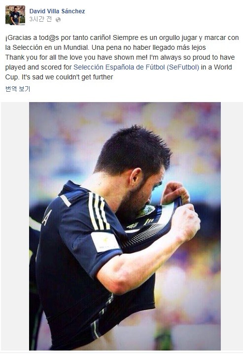 스페인 국가대표팀의 공격수 다비드 비야(33, 뉴욕 시티) 아쉬운 은퇴 소감을 밝혔다.스페인은 24일 오전(한국시간) 브라질 쿠리치바의 아레나 다 바이사다 경기장에서 열린 2014 브라질 월드컵 조별리그 F조 최종 3차전 호주와의 경기에서 3-0으로 대승했다.이날 다비드 비야는 전반 36분 선제골을 터뜨리며 페르난도 토레스, 후안 마타의 골을 포함해 스페인의 승리를 이끌었다. 특히, 이번 월드컵을 마지막으로 은퇴하는 다비드 비야는 후반 11분 교체되면서 만감이 교차하는 듯 눈물을 보였다.경기 이후 다비드 비야는 자신의 인스타그램을 통해 "지금까지 저를 사랑해주시고 성원을 보내 주신 모든 팬들에게 고맙다"고 전했다.이어 "항상 월드컵에서 스페인 대표팀을 위해 뛰며 득점할 수 있어서 자랑스러웠다"라며 "더 나아갈 수 없는 게 슬프다"며 스페인의 조별 예선 탈락에 대한 아쉬운 마음을 내비쳤다.한편, 다비드 비야는 A매치에서 57골을 터뜨리며 역대 스페인 대표팀 최다 득점 기록을 보유하고 있다. 지난 2010년 남아공 월드컵에서는 5골을 넣으며 스페인의 우승에 기여했다.[다비드 비야 은퇴소감, 사진=다비드 비야 인스타그램]