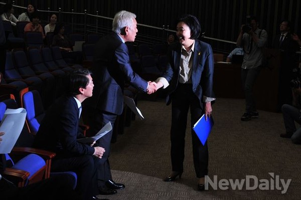 [포토]인사 나누는 새민련 김한길 대표와 박영선 원내대표