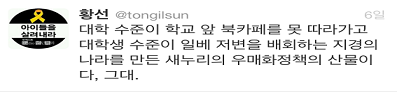 황선씨는 18일 오전 자신의 트위터에 "대학 수준이 학교 앞 북카페를 못 따라가고 대학생 수준이 일베 저변을 배회하는 지경의 나라를 만든 새누리의 우매화정책의 산물"이라고 썼다.