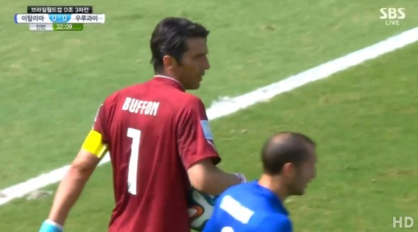 그 가운데 전반 32분 이탈리아의 골키퍼 부폰과 우루과이의 수아레스는 1 대 1로 맞섰다. 수아레스는 강력한 슈팅을 날렸지만 선방에 막히고 말았다. ‘거미손’ 부폰의 활약에 우루과이가 기를 펴지 못하고 있는 상황이다.
