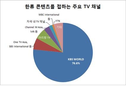 KBS World가 개국 11주년을 맞아 조사한 설문조사 결과, 해외 시청자들이 한류 콘텐츠를 접하는 가장 주요한 채널로 KBS World를 꼽았다. 이는 TV 뿐아니라 영역이 확대되고 있는 온라인 분야에서도 마찬가지 결과를 보였다. TV의 경우 KBS World가 76.6%로 Sony 계열의 One TV Asia 6.3%, 아리랑TV 6.0%, CJ 계열의 Channel M Asia 3.2%보다 월등했다. 한류가 가장 강한 아시아 지역에서도 KBS World 78.0%, One TV Asia 9.6%, Channel M Asia 5.3%, 아리랑TV 2.8%로 큰 차이가 없었다.